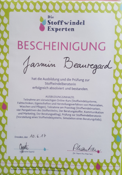- Februar 2017: Ausbildung zur Stoffwindelberaterin bei den Stoffwindelexperten, Prüfung mit Zertifikat im Juni 2017