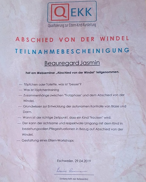- April 2019: Seminar "Abschied von der Windel" nach Emmi Pikler bei Lucia Cremer (Autorin, Kinderkrankenschwester)
