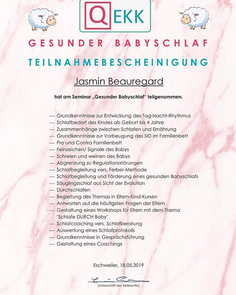 - Mai 2019: Fortbildung "Gesunder Babyschlaf" nach R. Largo bei Lucia Cremer (Autorin, Kinderkrankenschwester)